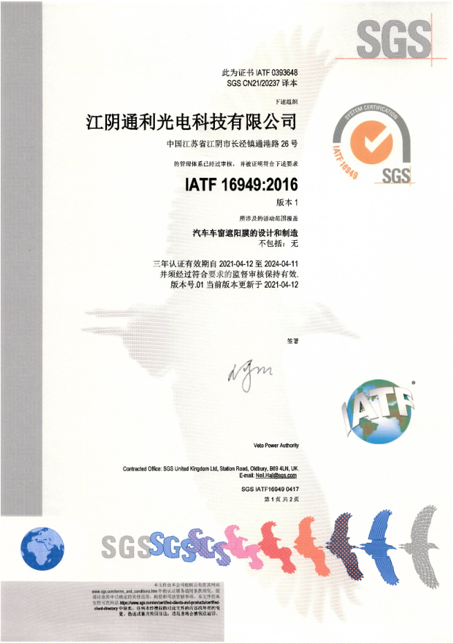 經(jīng)過嚴(yán)格審定,江陰通利光電科技有限公司順利通過了IATF(International Automotive Task Force)認(rèn)證,并收到了IATF16949:2016質(zhì)量管理體系認(rèn)證證書。其授予范圍:汽車車窗遮陽膜的設(shè)計和制造。