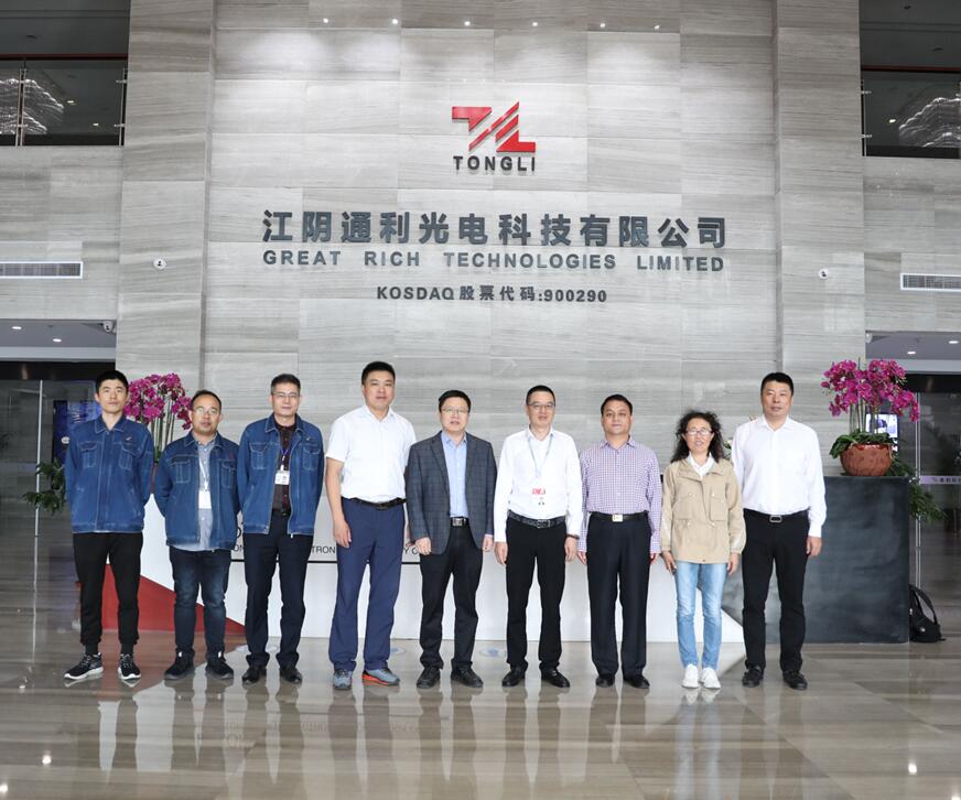 2019年10月22日,江陰市副市長、江陰市科技鎮(zhèn)長團團長許長春,江南大學化學與材料工程學院院長東為富,江陰市委辦公室主任徐海一行來到江陰通利光電科技有限公司(以下簡稱“通利科技”)參觀考察,鎮(zhèn)黨委書記江國虔陪同參觀。通利科技董事長周永南、副總經(jīng)理向江哲熱情接待。